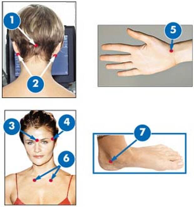 Проводить массаж лучше сидя - так, чтобы спина была прямая. Точки массируйте мелкими круговыми движениями, надавливая со средней силой по 1 - 2 минуте на каждую.