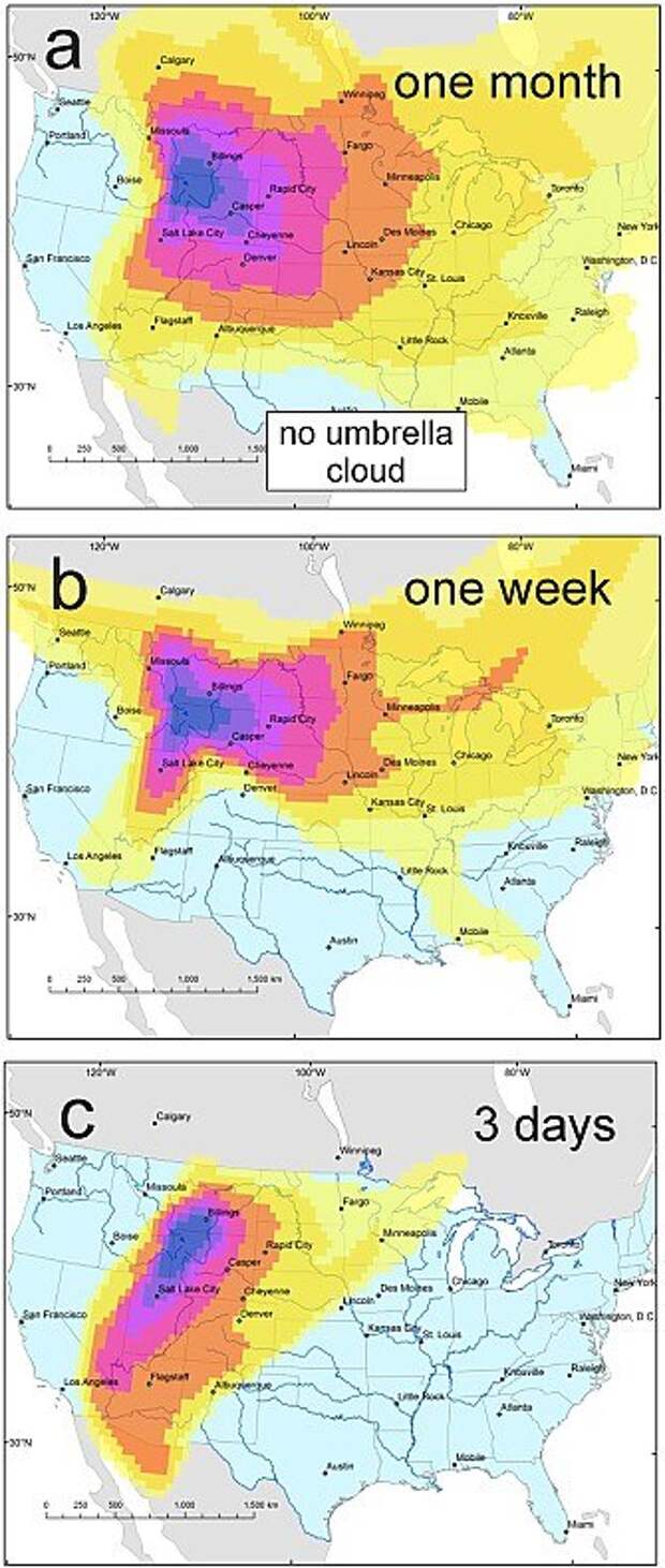 Расположенные вблизи населенные пункты будут покрыты его метровым слоем, а города, начиная от Среднего Запада и дальше – слоем пепла в несколько сантиметров. Огромное облако приобретет форму зонта, которое будет равномерно накрывать всю американскую территорию. Компьютерная модель, которая создана американской Геологической службой – это пилотный проект создаваемой системы вулканического моделирования, которая в будущем позволит прогнозировать вулканические извержения и распространения пепла, определяя толщину его слоя и направление перемещения облака этого пепла.